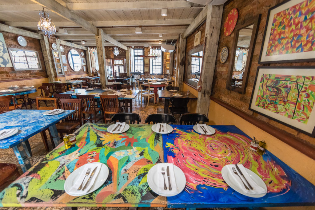 Recepción de la Casa de Tereza, da Chef Tereza Paim. Mesas pintadas por artistas plásticos, amigos de la Chef. Foto: Fábio Marconi