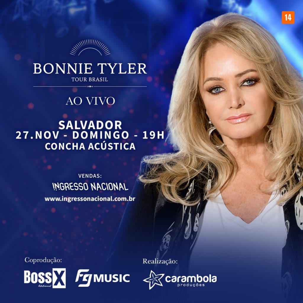 A diva pop galesa Bonnie Tyler chega à Concha Acústica do Teatro Castro Alves, no dia 27 de novembro, às 19h, com o show da turnê de comemoração de 50 anos de carreira, no qual também divulga seu álbum lançado em 2019, “Between the Earth and the Stars”. A turnê pelo Brasil, que começa em Tubarão (SC), passa por Florianópolis, Curitiba, São Paulo, Porto Alegre, Rio de Janeiro, Goiânia e se encerra em Salvador.