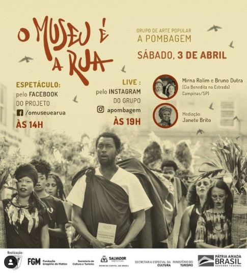 Ocorrerão ainda às rodas de conversa a serem transmitidas ao vivo nos mesmos sábados, sempre às 19 horas, pelo Instagram do grupo A Pombagem. Em formato de lives, os bate papos terão como convidados artistas de teatro de rua que dialogam com a questão do patrimônio cultural. No dia 03 de abril, a artista Janete Brito, integrante do A Pombagem, conversa com Mirna Rolim e Bruno Dutra, ambos da Cia Benedita na Estrada (Campinas/SP).