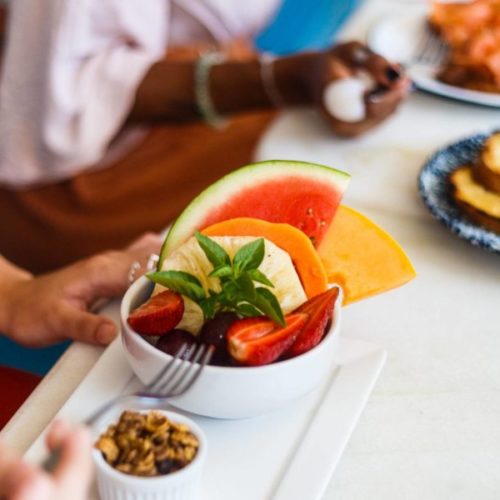 Nossa dica também é ir para o café da manhã, que funciona aos sábados e domingos, das 9h às 11h30. Uma ótima opção são as bandejas compostas por uma salada de frutas, um ovo mexido com pão na chapa, uma bebida quente a base de café e um suco. Já a bandeja “natureba”, troca o ovo por um queijo cotage ou queijo frescal com pão. Também tem os crostõnes que são sanduíches abertos. Um é o vegetariano, com creme de queijos, com abacate, tomate e molho pesto. O outro é um crostone de salmão defumado num brioche, que é um pão adocicado, e coalhada fresca. Os pães todos são feitos na sua frente, em uma cozinha com paredes de vidro.